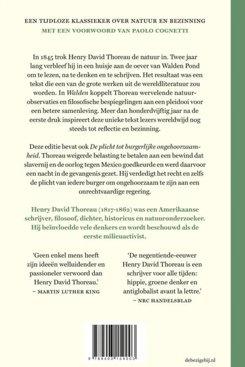 Deze editie bevat ook De plicht tot burgerlijke ongehoorzaamheid. Thoreau weigerde belasting te betalen aan een bewind dat slavernij en de oorlog tegen Mexico goedkeurde en werd daarvoor een nacht in de gevangenis gezet. Hij verdedigt het recht en zelfs de plicht van iedere burger om ongehoorzaam te zijn aan een onrechtvaardige regering.