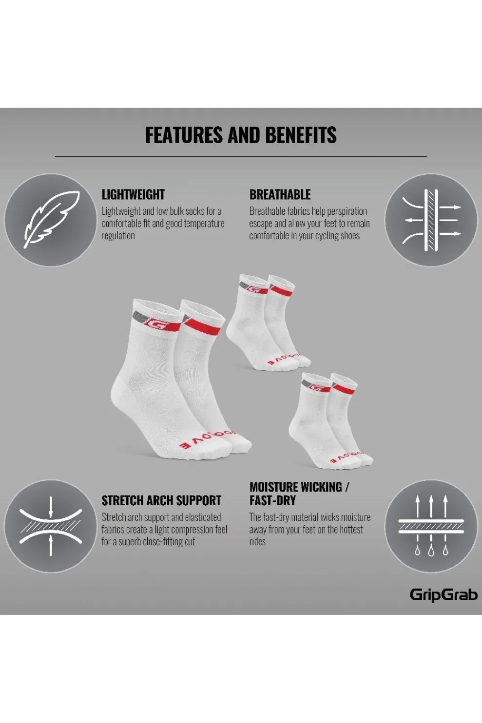 Het is allemaal begonnen met de GripGrab Classic Cycling Sokken… eenvoudige, comfortabele en duurzame zomer fietssokken. De Coolmax-mesh houdt je voeten koel en droog, zodat je je kilometers kunt maken in de zomerse hitte. De Regular Cut-versie eindigt net boven de enkel. Een goede deal, deze verpakking met drie paar sokken.