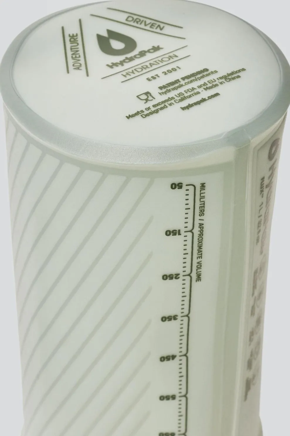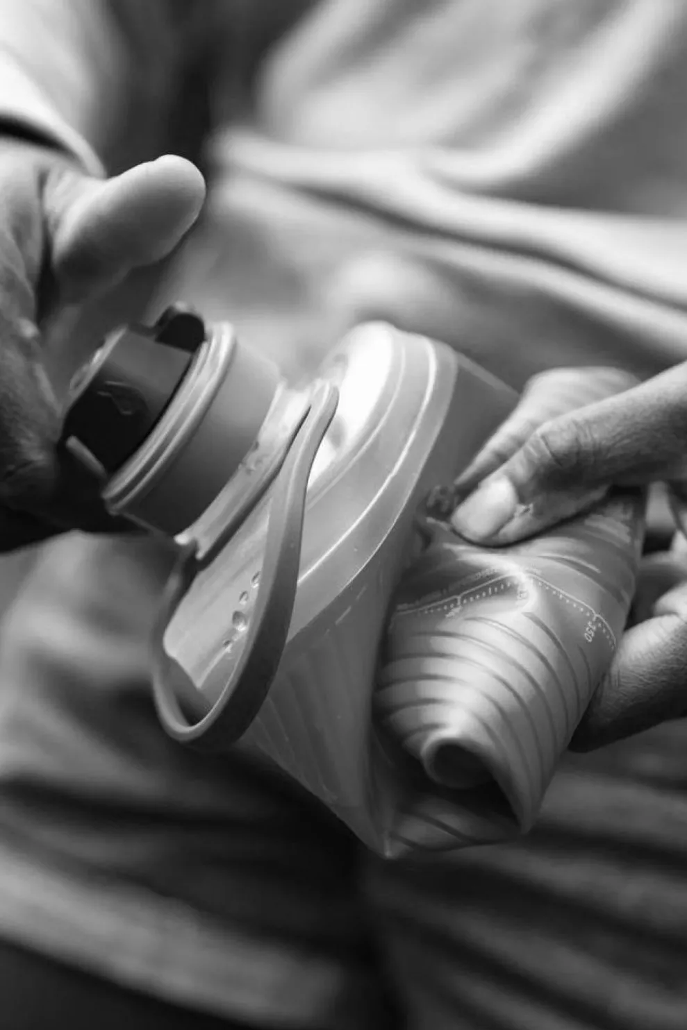 Deze drinkfles van 1 l lijkt op een harde fles, maar kan samengedrukt worden. Bovendien weegt ze met haar 102 g maar de helft.
