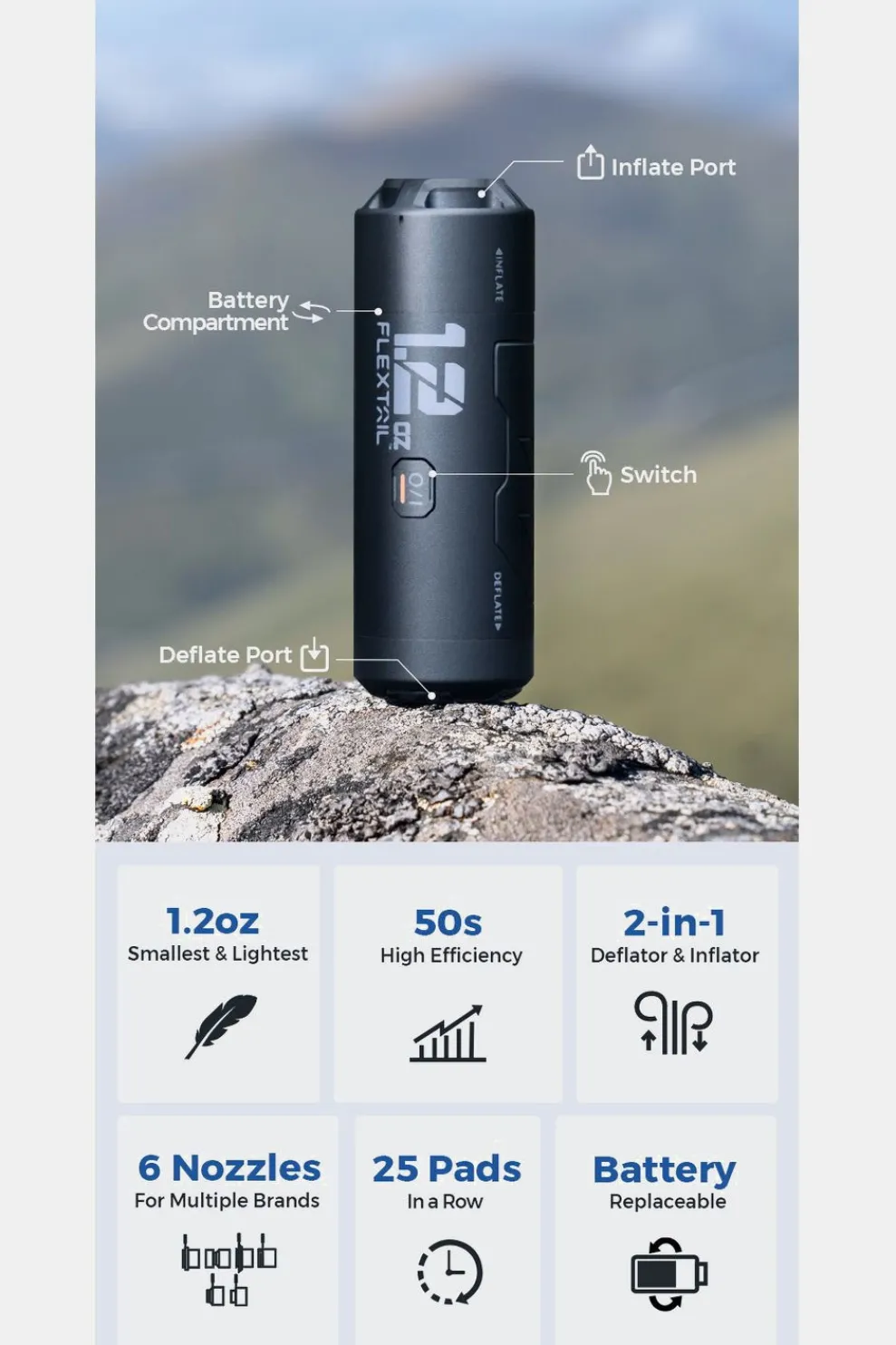 De Luchtpomp bevat de nieuwste Airvortech Technologie. De luchtbedpomp heeft een exclusieve micromotor, waardoor het apparaat kleiner is en toch superieure prestaties levert. Hij kan je slaapmatje in slechts 50 seconden opblazen en tot 25 slaapmatjes achter elkaar opblazen.