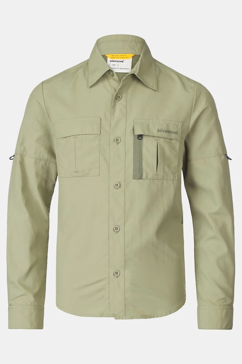 Praktisch ontwerp: Dit jongenshemd heeft een knoopsluiting en lange mouwen die eenvoudig opgerold kunnen worden voor extra ventilatie.
