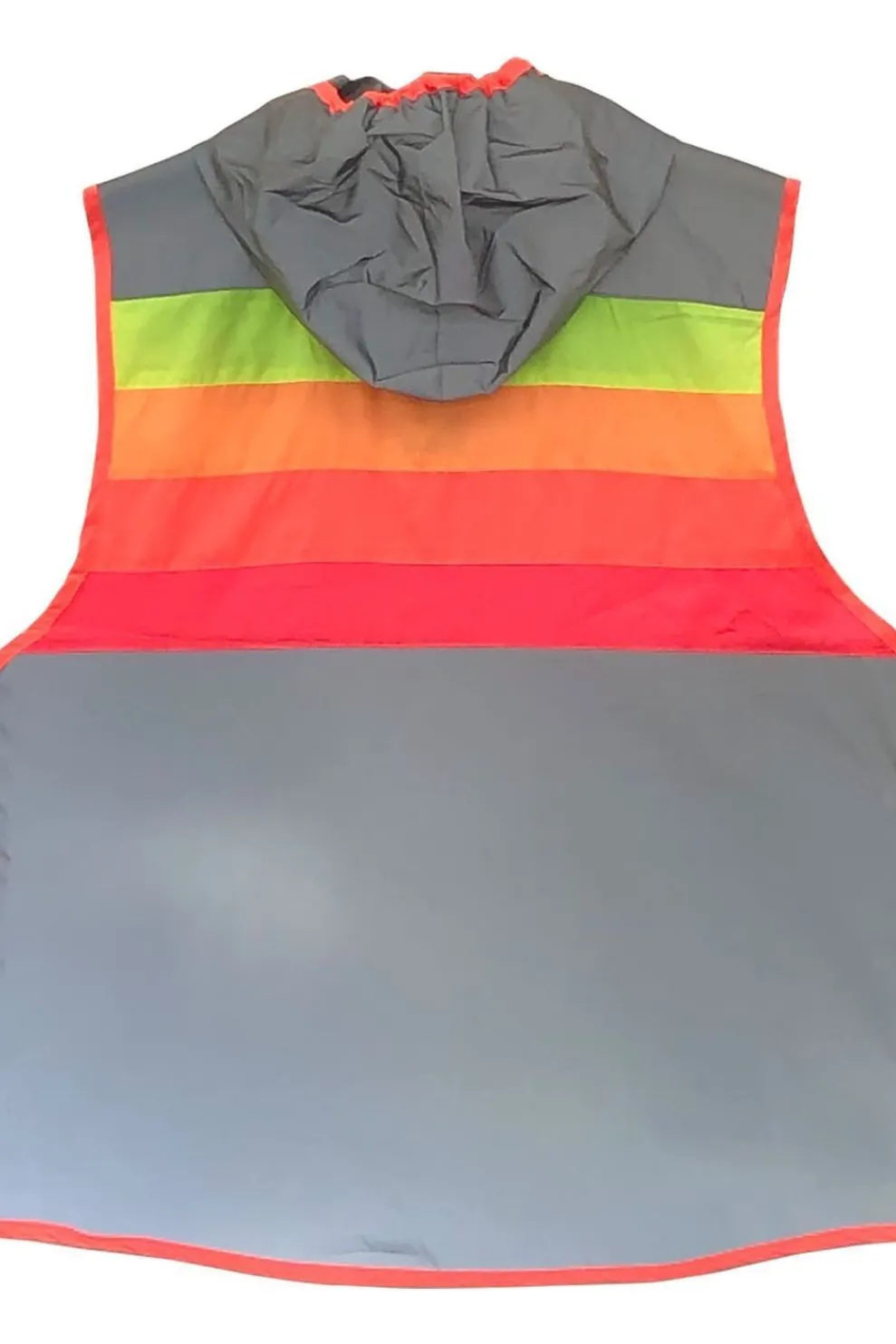 de reflecterende stof maakt jou extra zichtbaar in het donker, terwijl de fluo regenboogkleuren je overdag in de spotlight zetten. de lange achterzijde en zijzakje met blinde rits in de naad zijn extra handig tijdens het fietsen. schuif de dubbele rits naar het midden zodat je meer bewegingsvrijheid hebt.