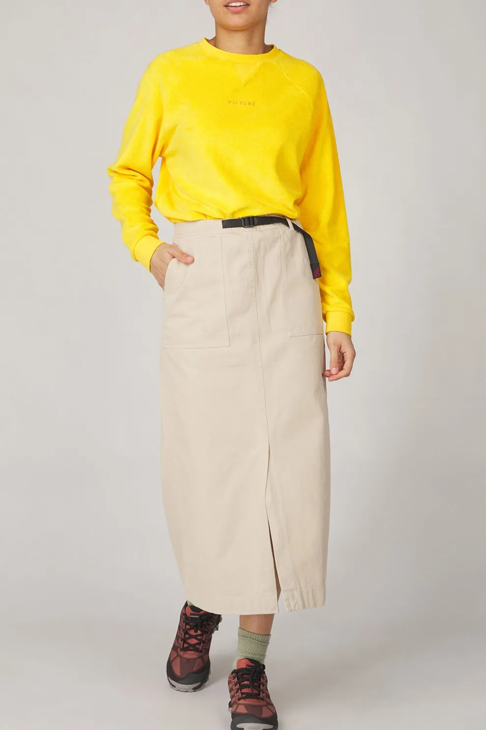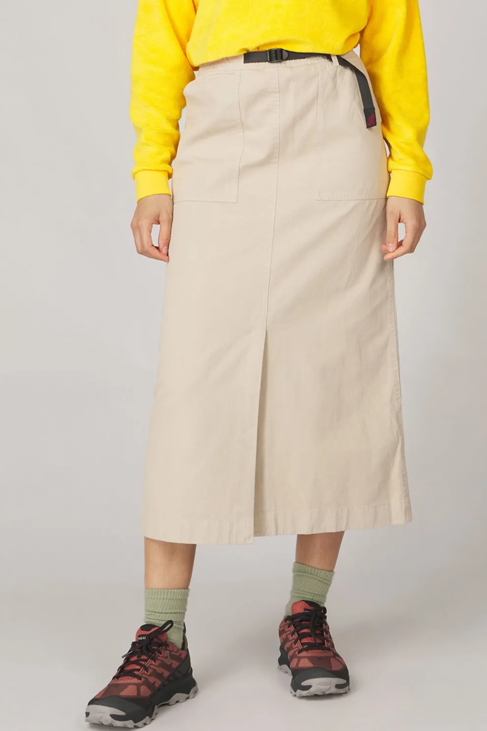 Een stijlvolle enkellange rok met een opvallende lange split aan de voorzijde. Vervaardigd uit hoogwaardig biologisch katoenen twill, dat niet alleen duurzaam en elastisch is, maar ook bestand tegen slijtage door intensief gebruik. Dit maakt de rok zowel praktisch als modieus voor dagelijks dragen.