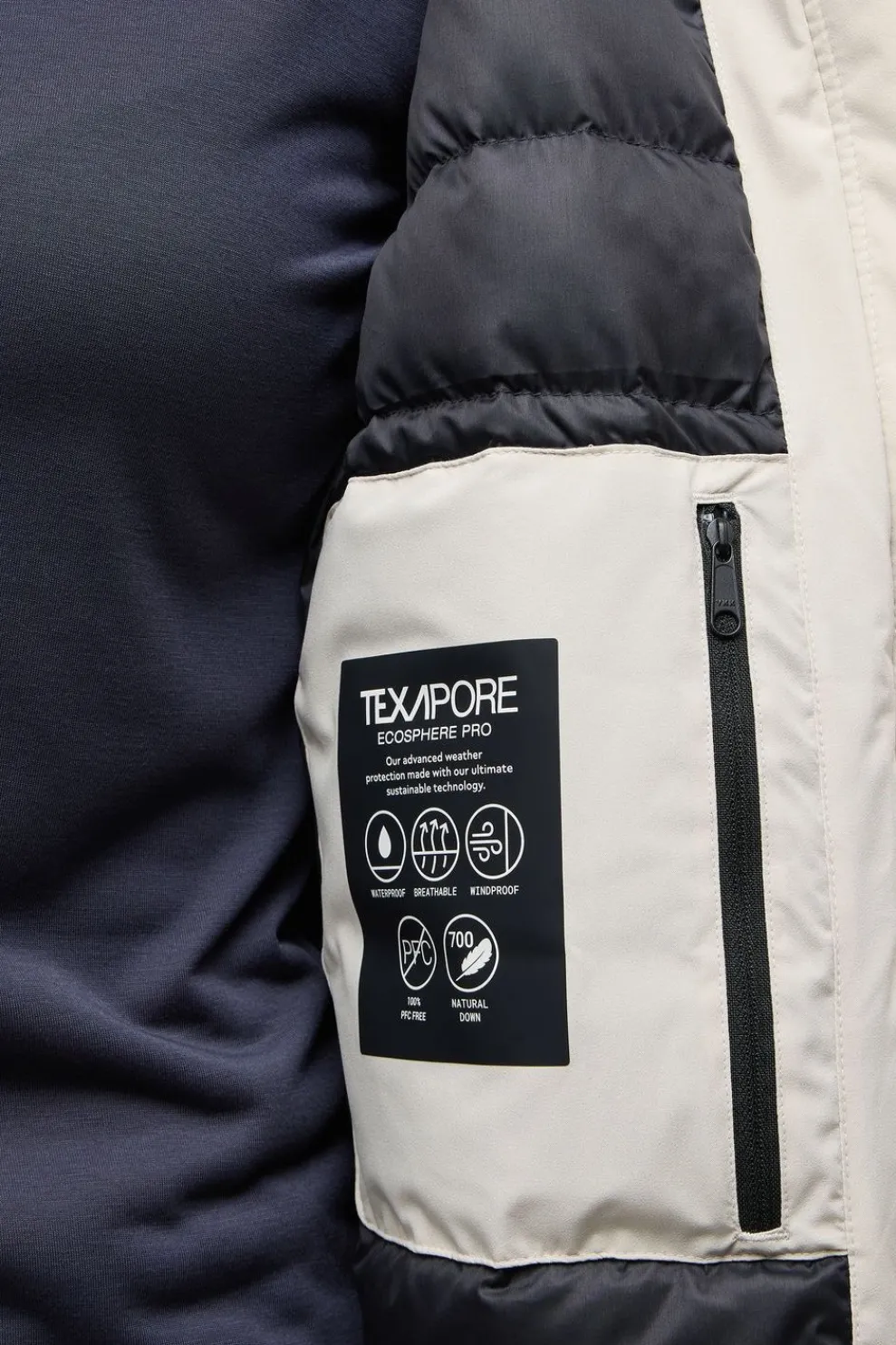 Waterdichte donsjas: Gemaakt van TEXAPORE ECOSPHERE PRO-materiaal voor uitstekende waterdichte bescherming, ideaal voor winterse omstandigheden.
