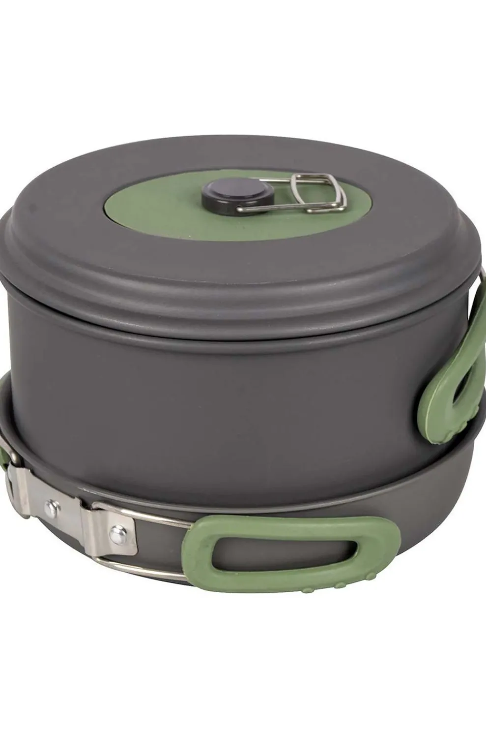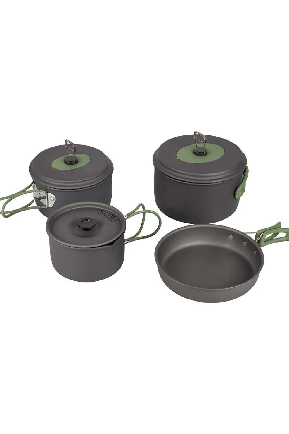 Een complete 4-delige lichtgewicht kookset. Deze pannenset bestaat uit 3 kookpannen met een deksel en een koekenpan. Bij uitstek geschikt voor outdoor gebruik. Te gebruiken op de warmtebronnen gas, keramisch, benzine en elektrisch. Gemaakt van stevig hard geanodiseerd aluminium waardoor er een verminderde kans is op aanbakken. Iedere pan is voorzien van een hittebestendige siliconen klapgreep. Deze handgrepen kunnen na gebruik eenvoudig om de pan worden geklapt zodat de pannen compact op te bergen en vervoeren zijn. Inclusief foedraal. Afmetingen kookpannen (Øxh): 13,5×7,5, 15,5×8,5 en 17,5×10,5 cm. Afmeting koekenpan (Øxh): 18×4,5 cm. Afmetingen genest (Øxh): 19×11,5 cm. Inhoud: 1, 1,4 en 2,2 liter.